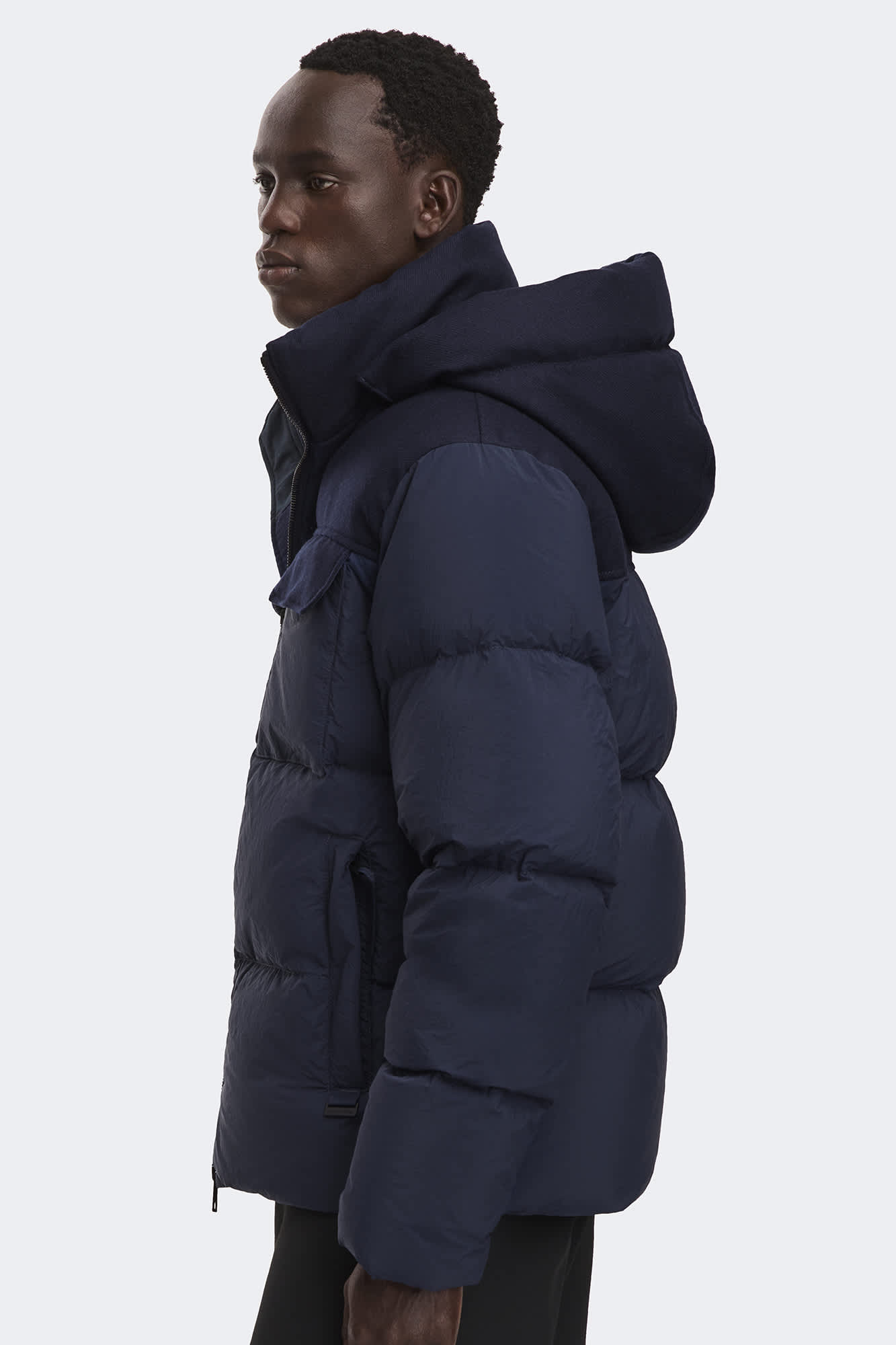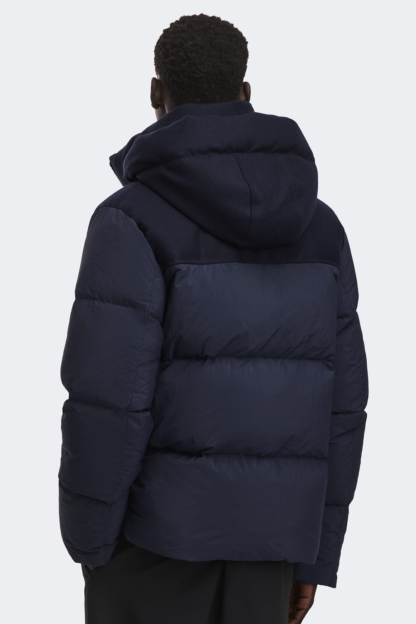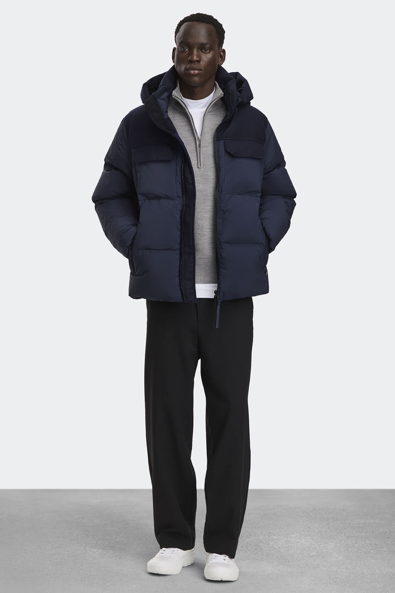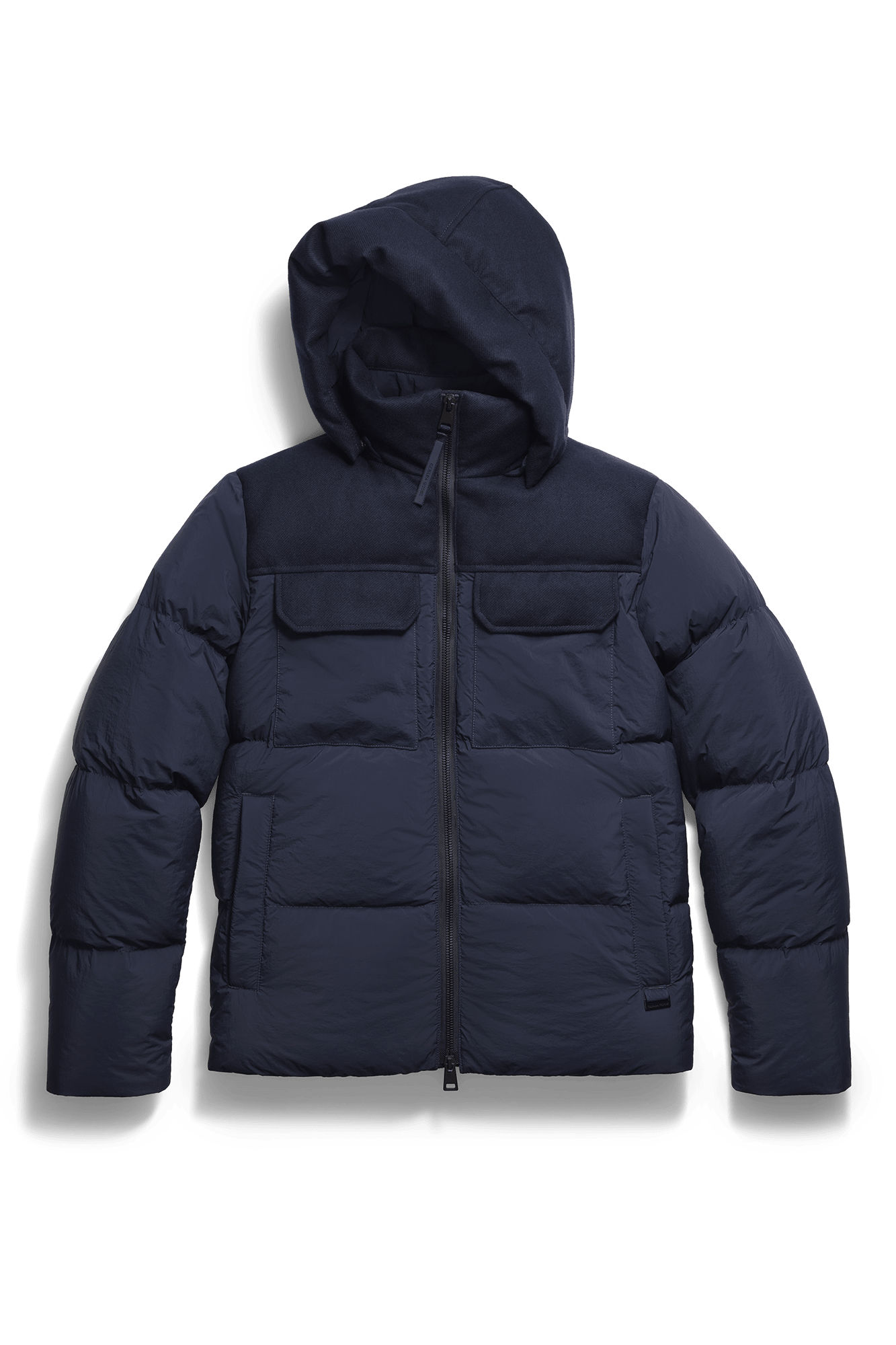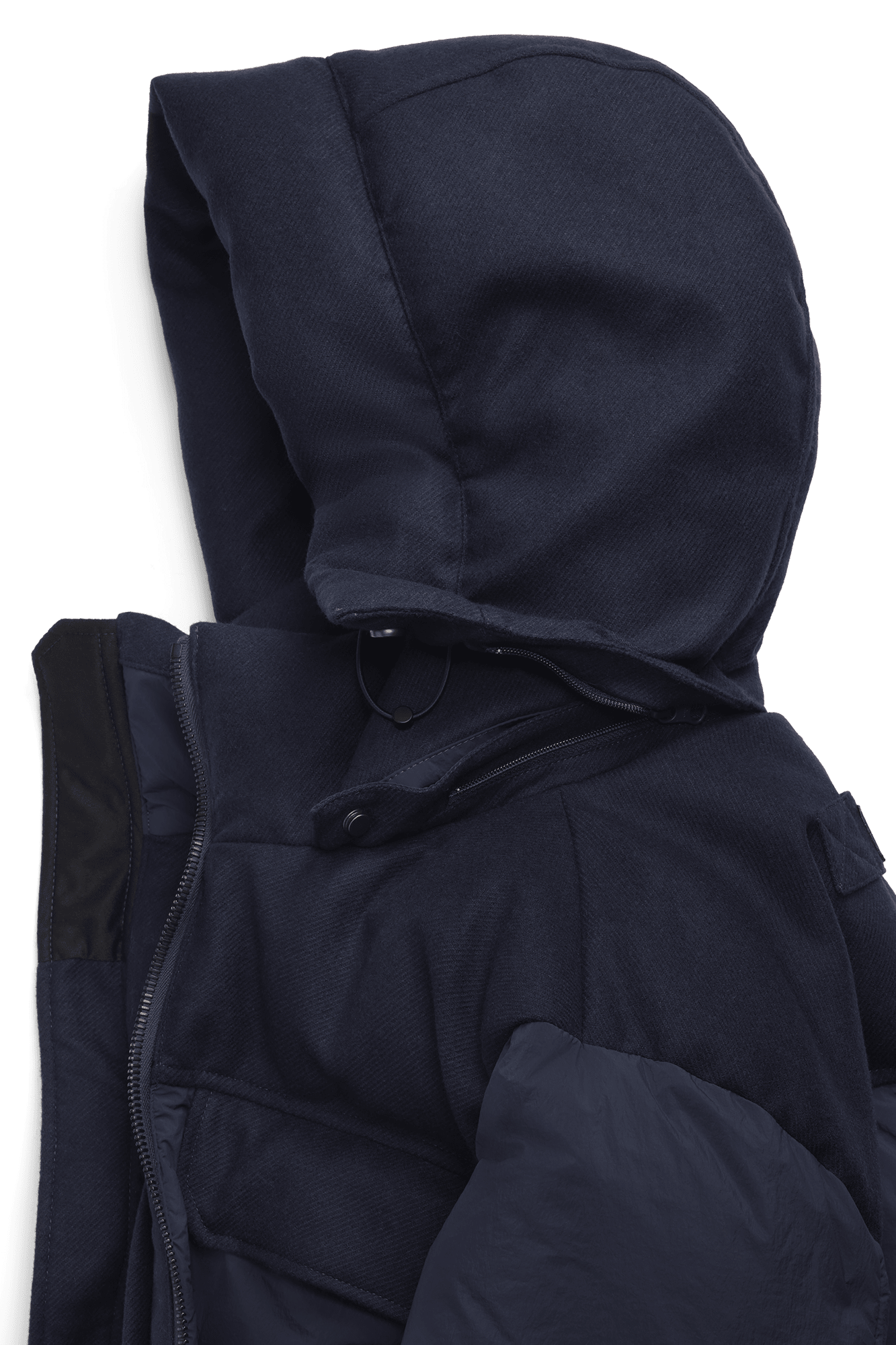 The Fairview Parka is crafted with plain weave nylon, a matte-finish fabric with a slightly crinkled texture. The shoulders and hood feature AlluraLuxe Herringbone Wool for a contrasting look. Remove the hood and tuck the zipper for a clean-finish collar.